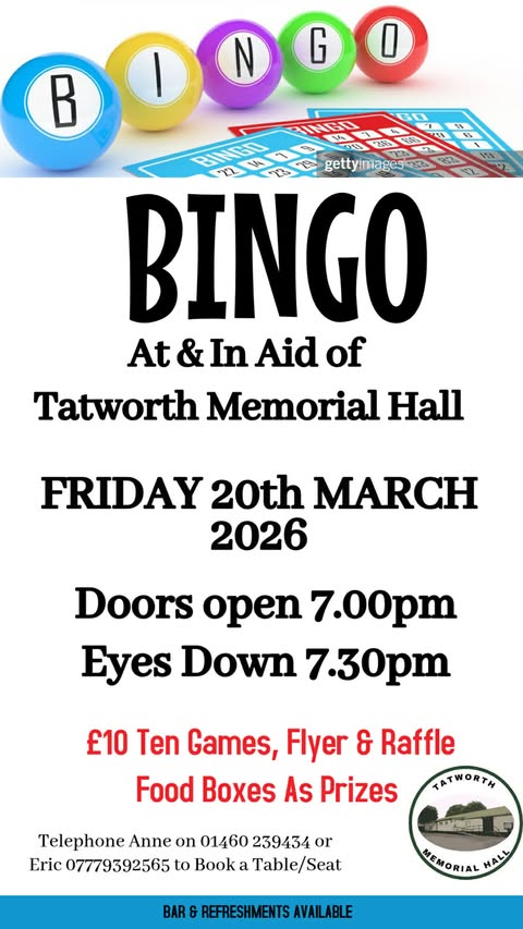Monthly BINGO At and in aid of Tatworth Memorial Hall.